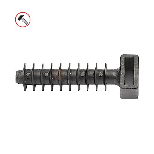 Kołki mocujące do opasek zaciskowych wykonane z Poliamidu 6. umożliwiające mocowanie przy pomocy opasek kablowych o szerokości do 9,0mm kabli, przewodów, rur w materiałach pełnych typu beton czy cegła. Dostępne w dwóch wysokościach, w kolorze czarnym. Mocowanie następuje we wcześniej wywierconym otworze o średnicy 8mm za pomocą młotka.